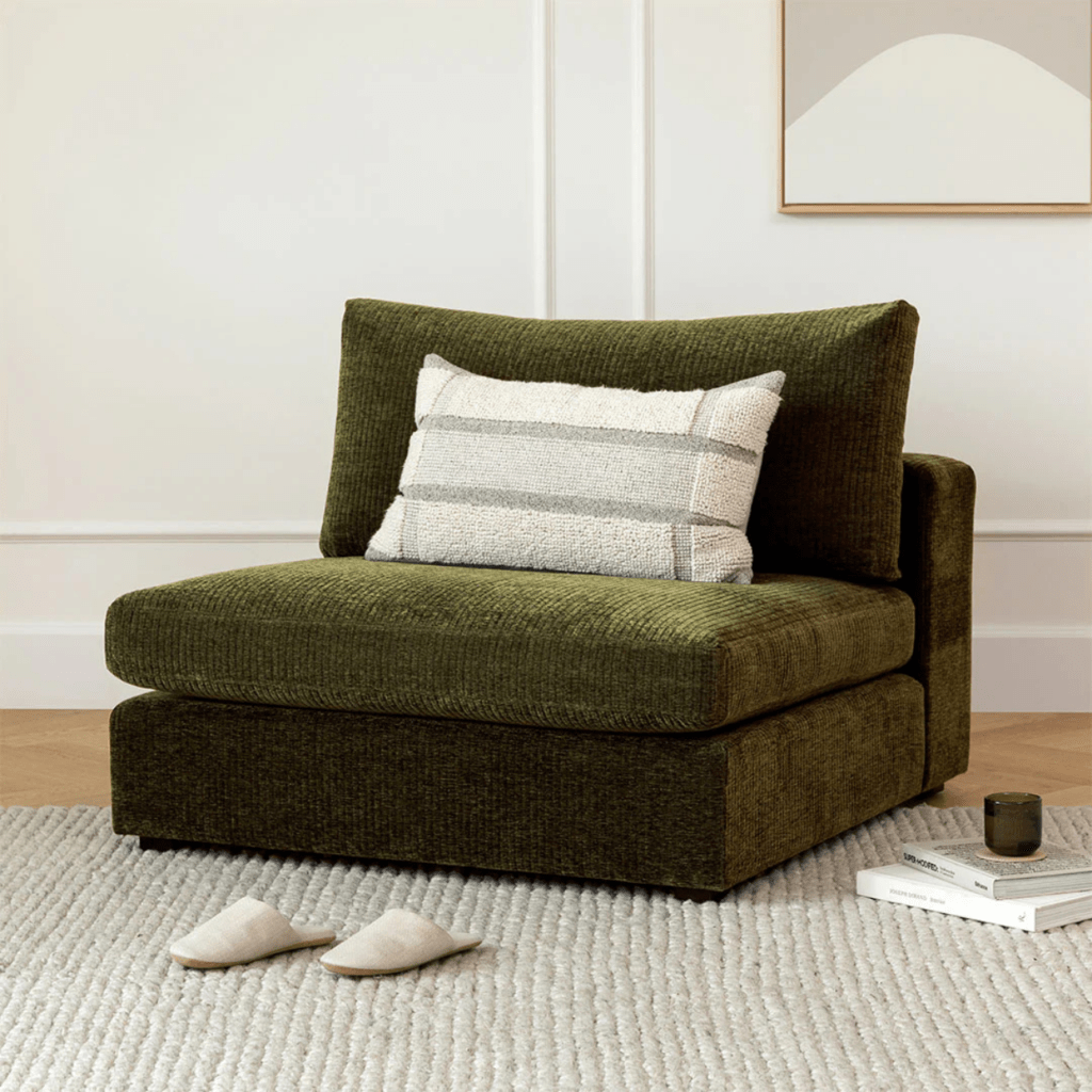 If you’re looking for a show stopping piece for your living room, this modular chair is a stunner. Not only do we love the deep cypress green color, but the ribbed detail also creates a cozy vibe. This is quite a large piece, so you may only have room for one of these in a small living space.