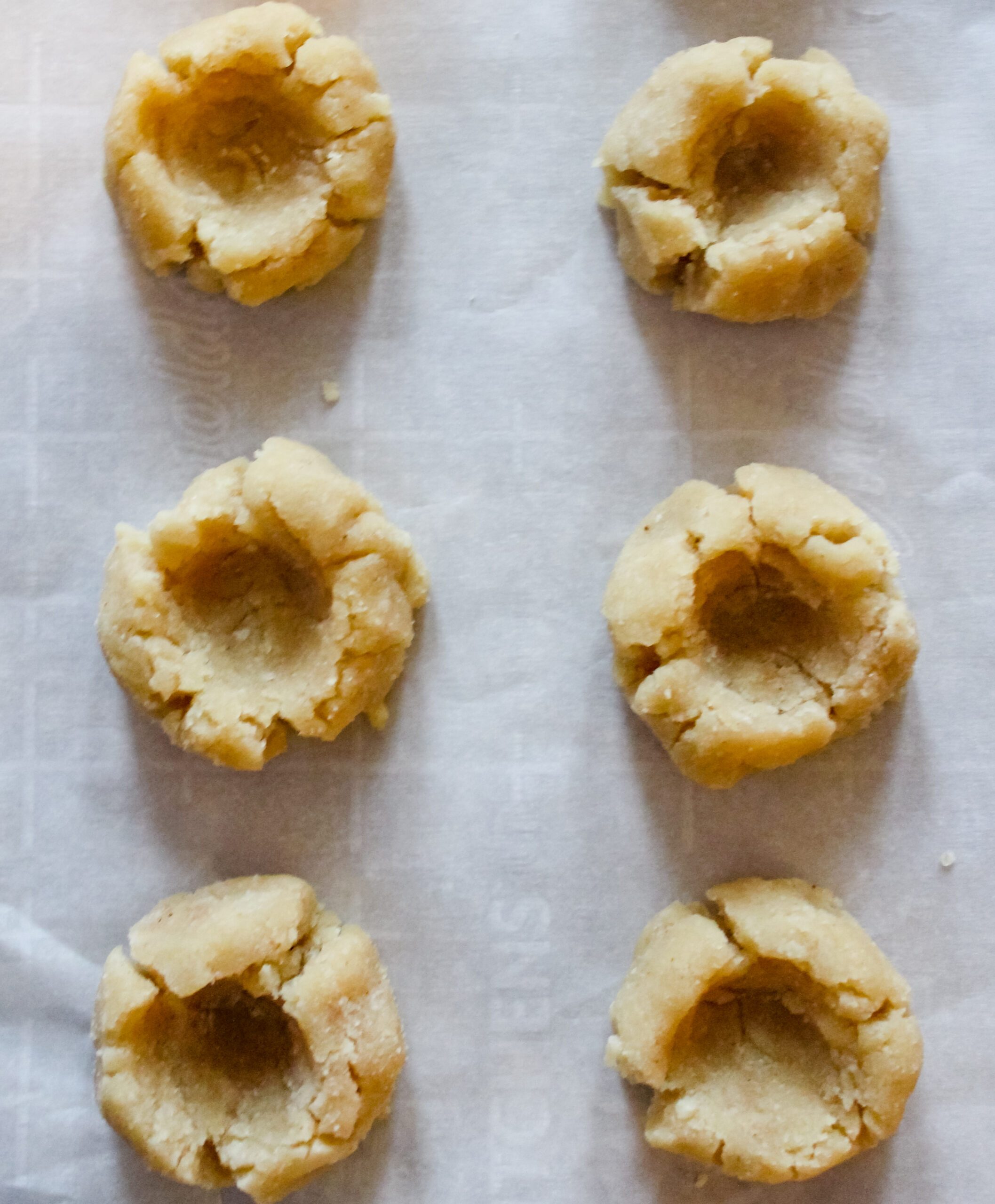 - Scoop and roll 1-inch dough balls and line on cookie sheet. Using your thumb, press into the center of each dough ball. (You may need to shape each one to form a nice thumbprint!)