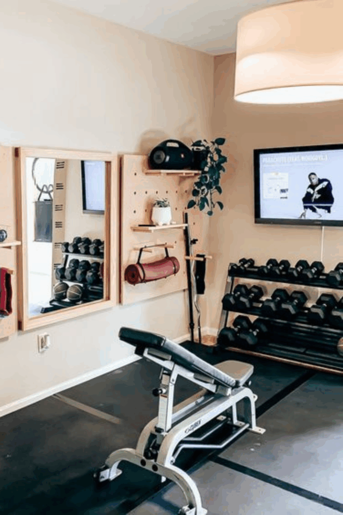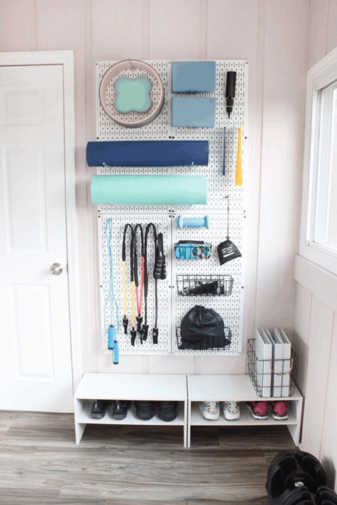 We love this beautifully designed and organized home gym idea. If we had enough space to DIY a pegboard gym we would!