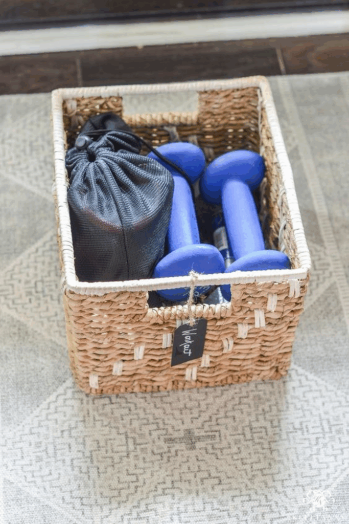 We have started working out at home more too, however we don’t have a designated room to keep all our workout equipment. After we finish a workout in our living room, we roll up our yoga mat, pick up our weights and place them in a basket in our room.