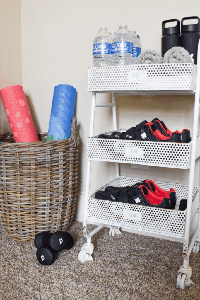 Keeping it as simple as a small cart for your resistance bands, weights, towels and water bottles is perfect. You don’t have to go above and beyond. Add a woven basket to store your yoga mats off to the side as well.
