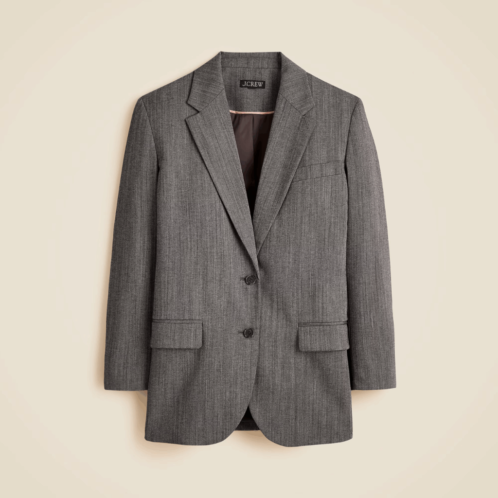 Looking for a stylish loafer outfit for the office? This simply styled look is super easy to pull together, and combines pieces you may already have in your fall wardrobe. Style a cream rollback sweater with a mini pleated grey skirt. Then, throw on a matching grey, oversized blazer. Lastly, pull on some scrunchy white socks with your favorite black loafers.