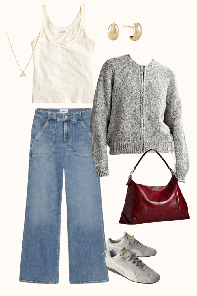 Pair the jeans with a ruffle-trim cami and a light sweater jacket (like this one from One Mile). Complete the look with some grey sneakers and a pop of color — this gorgeous red bag from Anthropologie.