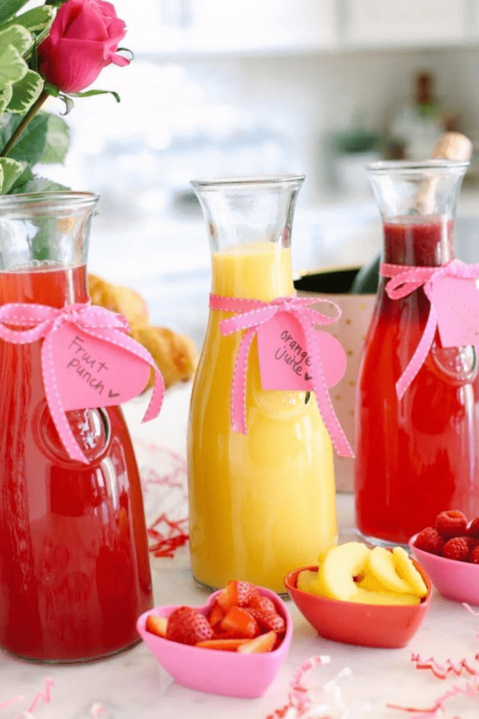 If you’re hosting a Galentine’s Day brunch, a mimosa bar is a must. Plus, it’s super easy to set up. All you need is a couple of bottles of champagne and your juice of choice. Orange juice is an obvious choice, but add some red and pink juices to the mix, like grapefruit juice and cranberry juice.
